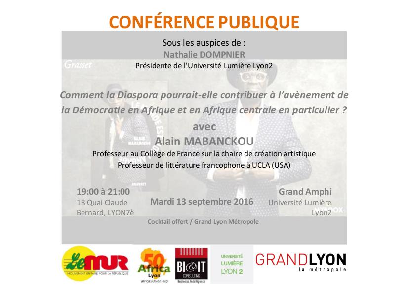 ALAIN MABANCKOU EN CONFÉRENCE PUBLIQUE , LE MARDI 13 SEPTEMBRE 2016 A LYON