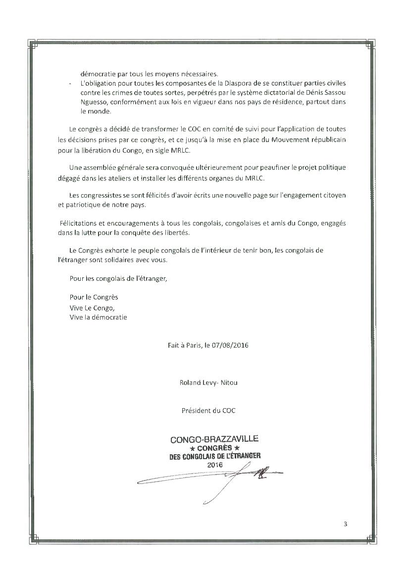 COMMUNIQUE FINAL DU CONGRES DES CONGOLAIS DE L’ETRANGER DU 6 AU 7 AOÛT 2016