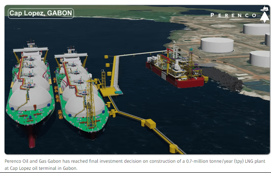 PERENCO Projet Gabon LNG : 1 milliard de dollars/ 700.000 T/an Sans tambour, ni trompette de son côté, Perenco avait fait l’annonce, le 16 février 2023, de la Décision finale d’investissement (FID) pour la construction d’une unité de production de Gaz naturel liquéfié (GNL) sur le terminal pétrolier de Cap Lopez au Gabon ; après son approbation technique par les autorités gabonaises en décembre 2022.
