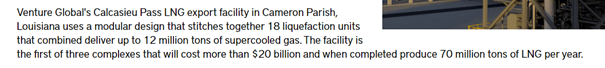 Mais ce n’est pas tout ! Pour enfoncer le clou et augmenter le flou du Projet Congo LNG fixé à 10 milliards de dollars pour 3 millions de tonnes/an de LNG, entre les deux amis de longue date, Claudio Descalzi, l’Ingegnere, et l’omniscient autocrate, et docteur en exploitation pétrolière et gazière, Denis Sassou Nguesso : un leader nord-américain de la production de LNG à cout réduit, Venture Global LNG annonce un projet en cours : coût 20 milliards de dollars (2 fois celui du Projet Congo par ENI) pour une production de 70 millions de tonnes (soit 23 fois la capacité de production du Projet ENI).