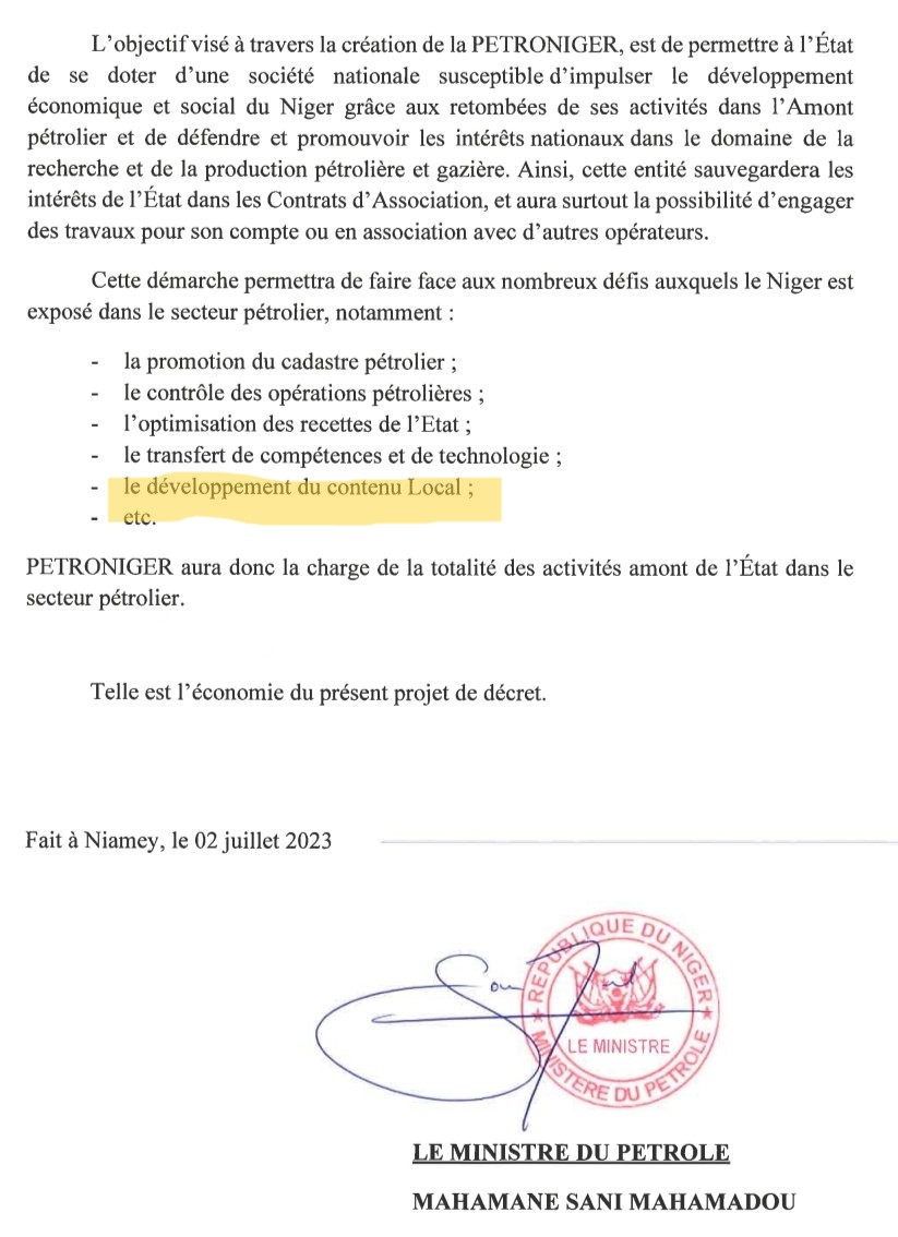 Jusqu’à ces dernières semaines, c’était la Société nigérienne de pétrole (SONIDEP) qui gérait les affaires pétrolières, principalement le stockage et la commercialisation locale des produits pétroliers. La nécessité d’une Société Nationale Pétrolière, avec statut de Société d’État au sens de l’Ohada, donc PETRONIGER, s’est imposée avec le développement de la production pétrolière dans ce pays ; avec pour mission, la gestion des actifs et des participations de l’État et la conduite des opérations pétrolières Amont.