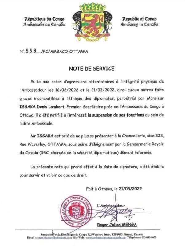 L’ambassadeur du Congo au Canada, Roger Julien Menga a été sérieusement bastonné par le premier secrétaire près de l’Ambassade du Congo à Ottawa, Denis Lambert Issaka. Il a été notifié à l’intéressé la suspension de ses fonctions au sein de ladite Ambassade, selon une note de service de la chancellerie congolaise au Canada dont une copie est parvenue ce lundi à notre rédaction.