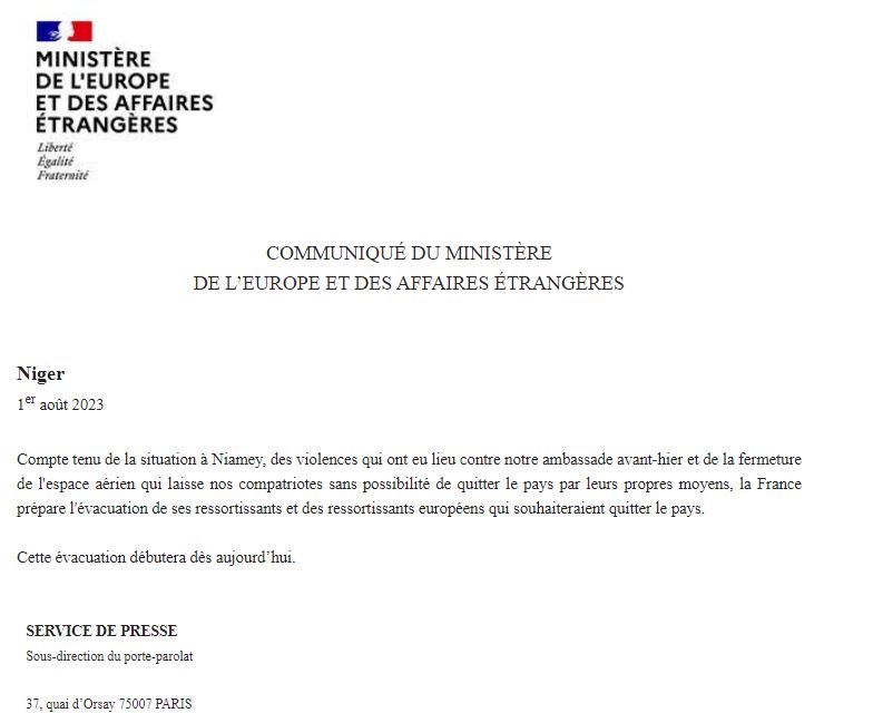 Après les coups d’État au Burkina Faso et au Mali, Paris est resté comme démuni face à une rechange stratégique ; avec 1500 soldats « déclarés » et déployés au Niger, le président Macron ne peut laisser le Niger aux mains des groupes djihadistes qui aujourd’hui remportent des succès énormes au Mali près de la ville de Meneka. Ces groupes djihadistes dans l’imaginaire collectif français peuvent un jour s’attaquer aux intérêts français au Sahel et voire au-delà de la Méditerranée. Le président Macron a tenu un discours martial en avertissant les putschistes et leurs affidés d’une riposte française implacable et intraitable, si des violences étaient commises contre les ressortissants, l’armée, les diplomates et les entreprises françaises. Après avoir hésité à évacuer les 500 à 600 ressortissants français, la décision a été prise de le faire au nom du principe de précaution doctrinale et stratégique qui entoure la présence des forces extérieurs à l’étranger. Malgré le coup d’État, l’extraction d’uranium continue selon le journal « Le Monde » du mardi 1er aout 2023.
