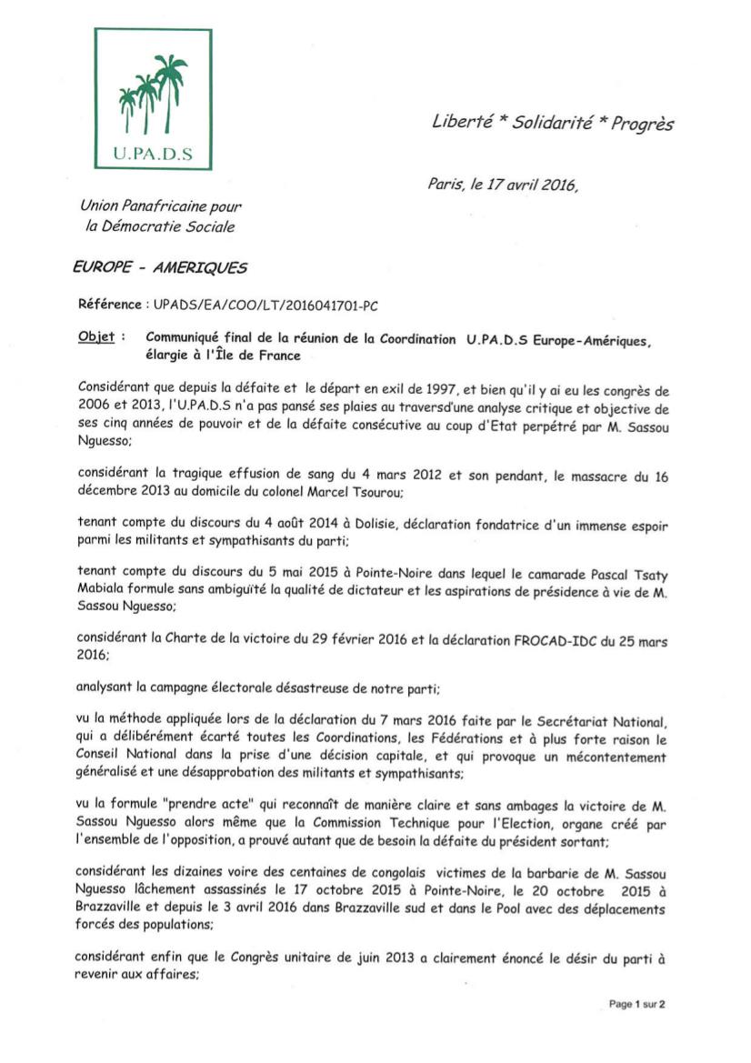 L’UPADS – EUROPE – AMERIQUES DESAVOUE PASCAL TSATY-MABIALA
