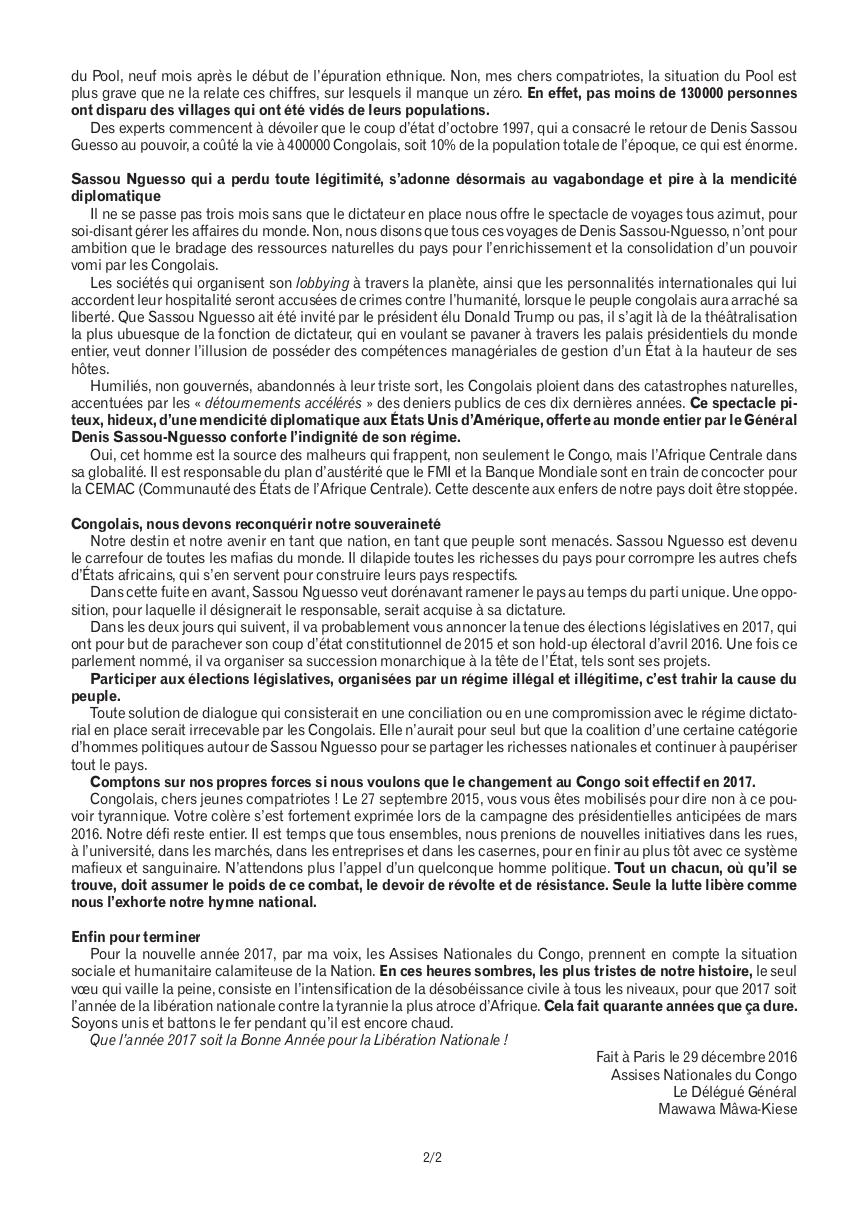 MESSAGE A LA NATION : Assises Nationales du Congo + Mouvement Unitaire pour la République.