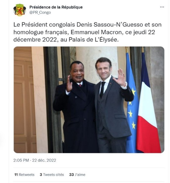 Annoncée pour le 17 décembre 2022 par la très informée Africa Intelligence dans sa publication du 9 décembre 2022, la rencontre entre le Président Emmanuel Macron et l’octogénaire et autocrate congolais AURAIT eu lieu le jeudi 22 décembre 2022.